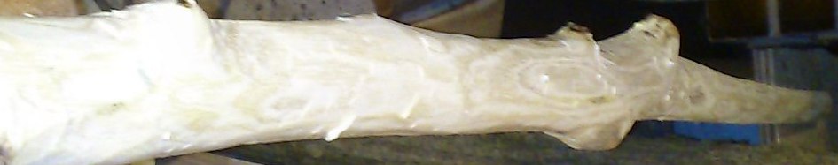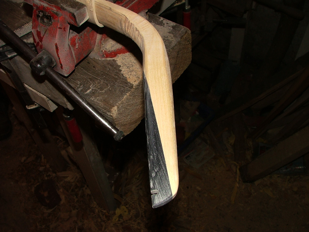 beinahe in den Wahnsinn gertieben hat mich der Entschluss dem Bogen 5 eckige Hornnocks zu verpassen, ich wollte das Profil bis in die Spitzen der Nocks durchziehen, ohne dabei die Linie des Recurves rückenseitig zu stören, ich mein den kleinen Buckel der es bei Hornnocken erlaubt, die Sehnenkerbe tief genug zu machen. Bei einem geraden Bogen ist das erträglich (obwohl mich die Form auch dort an einen schwangeren Regenwurm erinnert), bei recurven Wurfarmenden ist der Buckel stylistisch einfach nur unerträglich, letztlich ist es mir aber nach einigen Schwierigkeiten gelungen dieses stylistische Problem zu lösen.