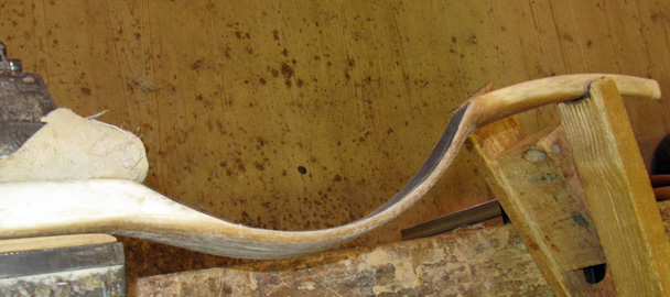 Ich bin weiterhin verblüfft, dass der Bogen doch recht kräftig geworden ist. Bei aktueller Progression sollte der Bogen bei 28 Zoll Auszug um die 63 Pfund haben. Bei weiterer Trocknung/Konditionierung kommen vielleicht doch noch um die 70 Pfund zusammen - es bleibt spannend.