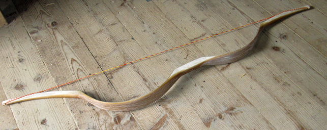 • Nun lass ich den Bogen 1-2Stunden aufgespannt, damit sich der Sehnenbelag strecken kann. Nebenbei korrigiere ich die Wurfarme mit Wärme.