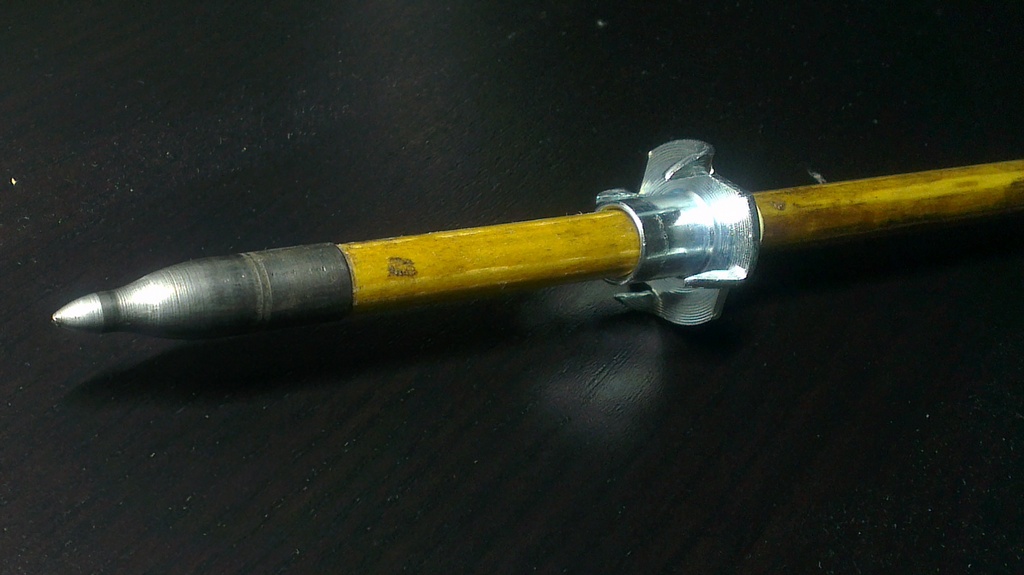 Einfach mal so ein Ding an einem alten Pfeil montiert. Abfliegen kann das Metall nicht, über die Spitze kann das Gewinde nicht hinaus und auch sonst ist es sehr fest. Wenns klappt wäre es besser leichtere Spitzen zu verwenden, mit dem Zusatzgewicht passt der Spine wahrscheinlich nur noch für 40# Bögen und dann bin ich bei 13,5gpp mit recht viel FOC. Die 11/32 Schäfte haut es bei den alten Stramitscheiben nicht so tief rein. Egal, es ist nur ein Test!