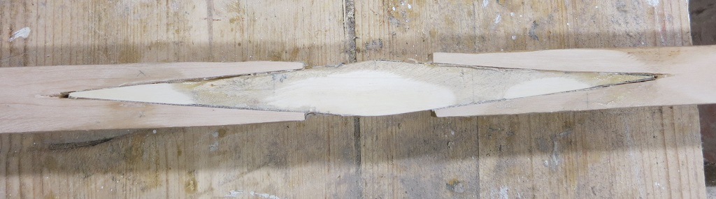 In dem Falle habe ich "honigdicken" Hautleim verwendet und den Spleiß mit Klemmen seitlich zusammengedrückt, ziemlich fest sogar. Ich hätte gefhofft, dass der Leim beim Trocknen das Holz zusammenzieht und die Sache somit hält.