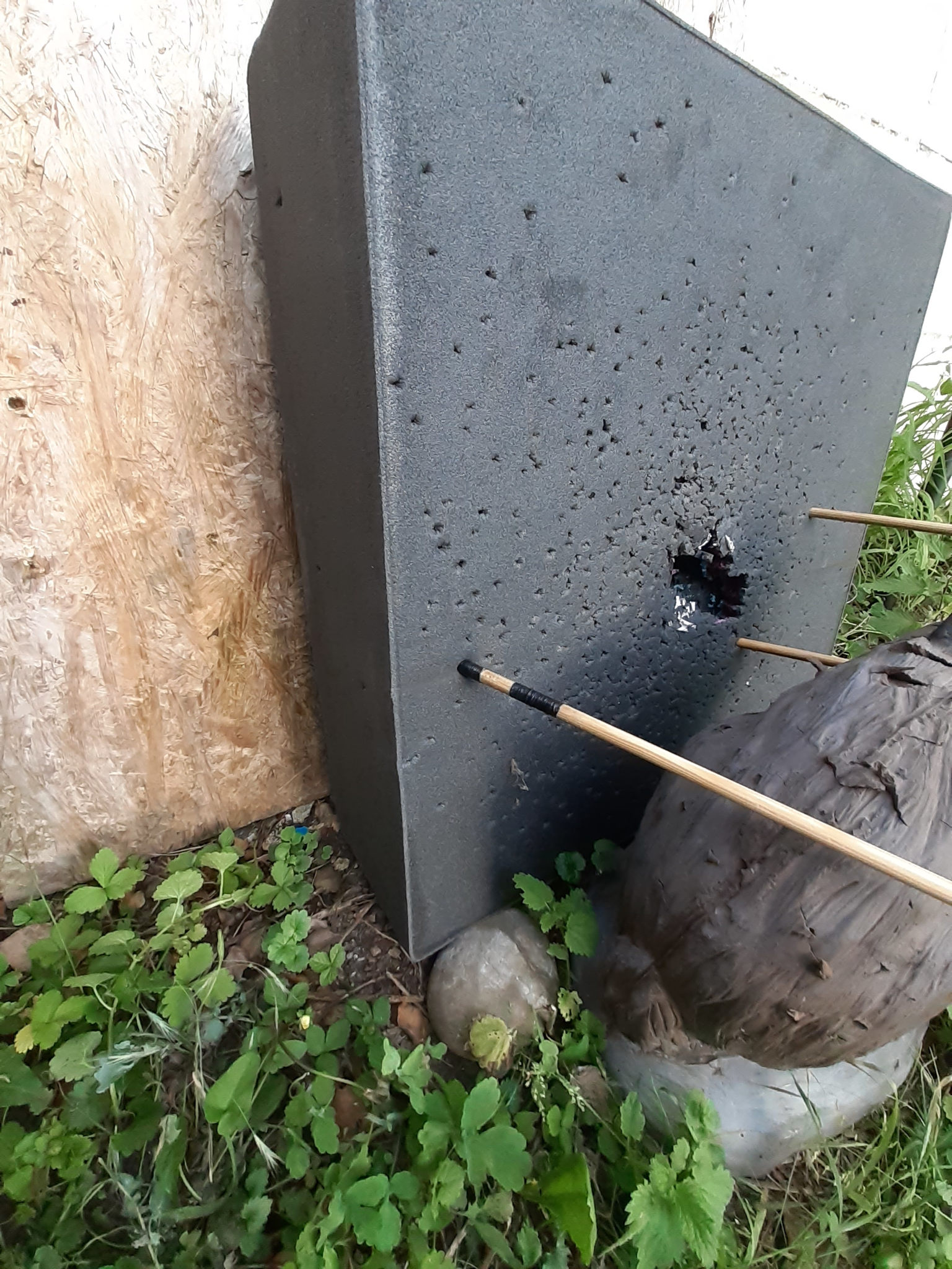 Die andere Platte dahinter ist nur für den Photo-Kontrast für die Spitze, die steht normalerweise daneben,um Fehlschüsse nicht in die Mauer zu setzen. :D
