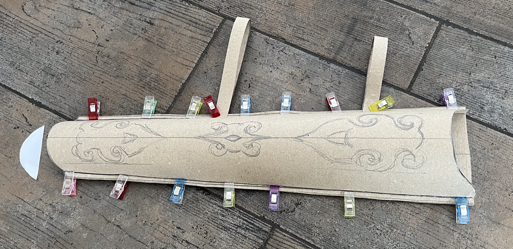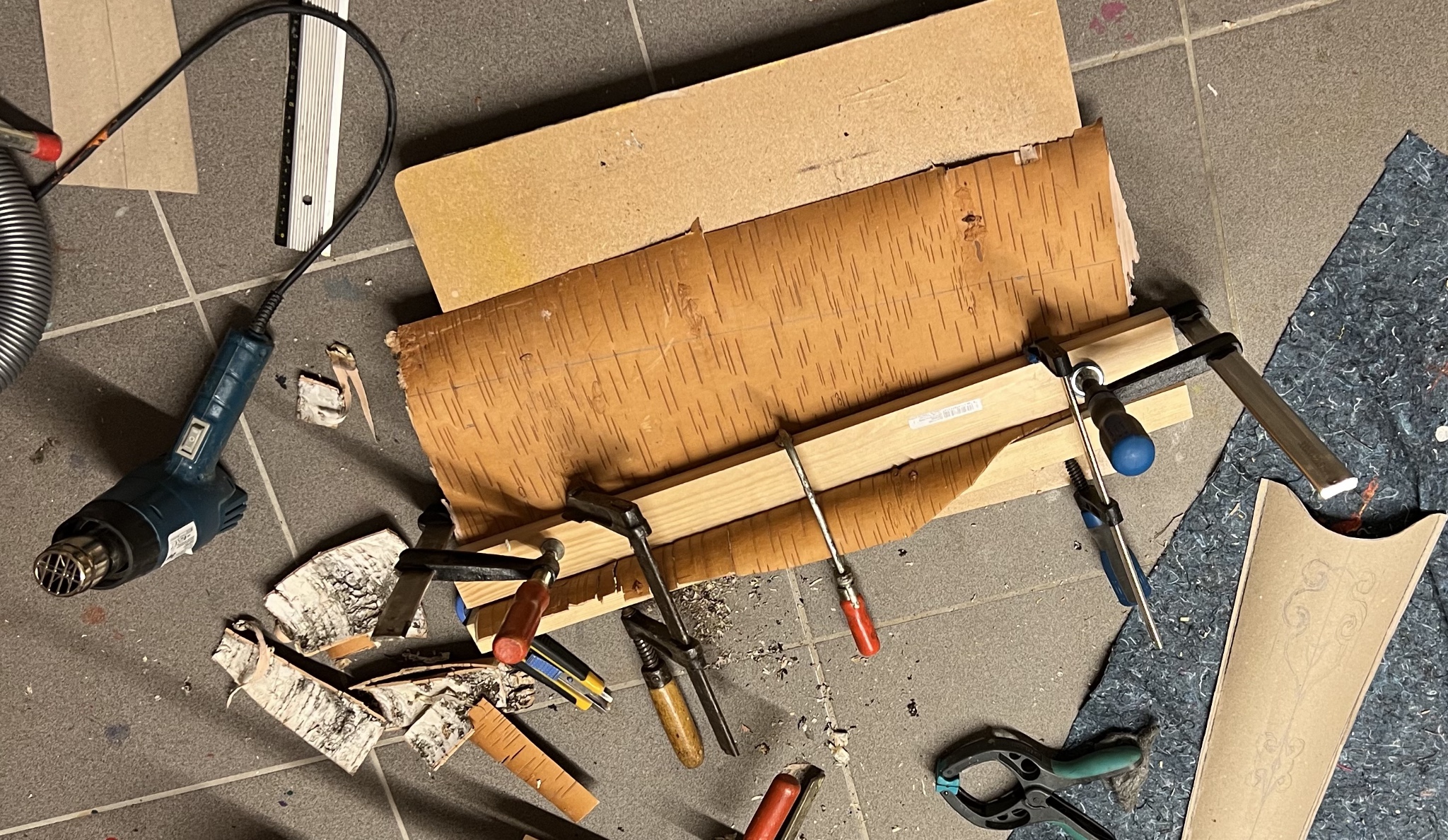 Nach dem Auspacken heute morgen: wegen der Verpackungsfolie greift es sich noch feucht an, es scheint alles blasenfrei zu kleben und es finden sich keine Abdrücke an der Rindenoberfläche durch die Wicklungen. Die Rinde ist im Vergleich zu Birkenrinde viel dicker und schwerer formbar. Die kritischen Stellen beim Biegen werden die Seitenwände sein. Da werde ich versuchen die Rinde stark auszudünnen. Birkenrinde bleibt aufgrund der Dünne und Weichheit gleich in Form kleben und man kann bauchseitig die Ränder mit dem Skalpell gerade schneiden und den Überschuss abziehen, das geht bei Kirschrinde nicht, weil es aufgrund der Steifheit an den Seiten nicht kleben bleibt. Jetzt mal alles gut trocknen lassen, dann Schleifen (vor allem die Seitenwände ausdünnen) und mit Stahlwolle polieren.