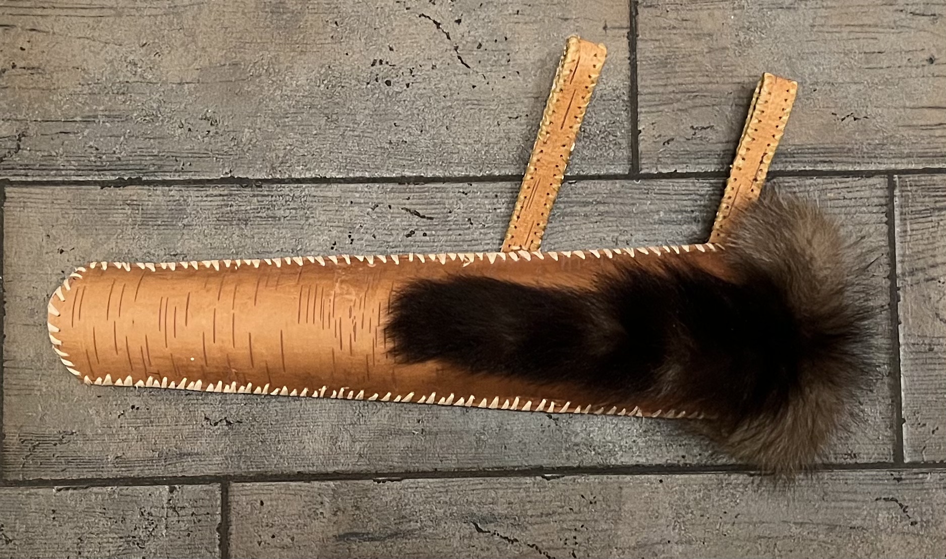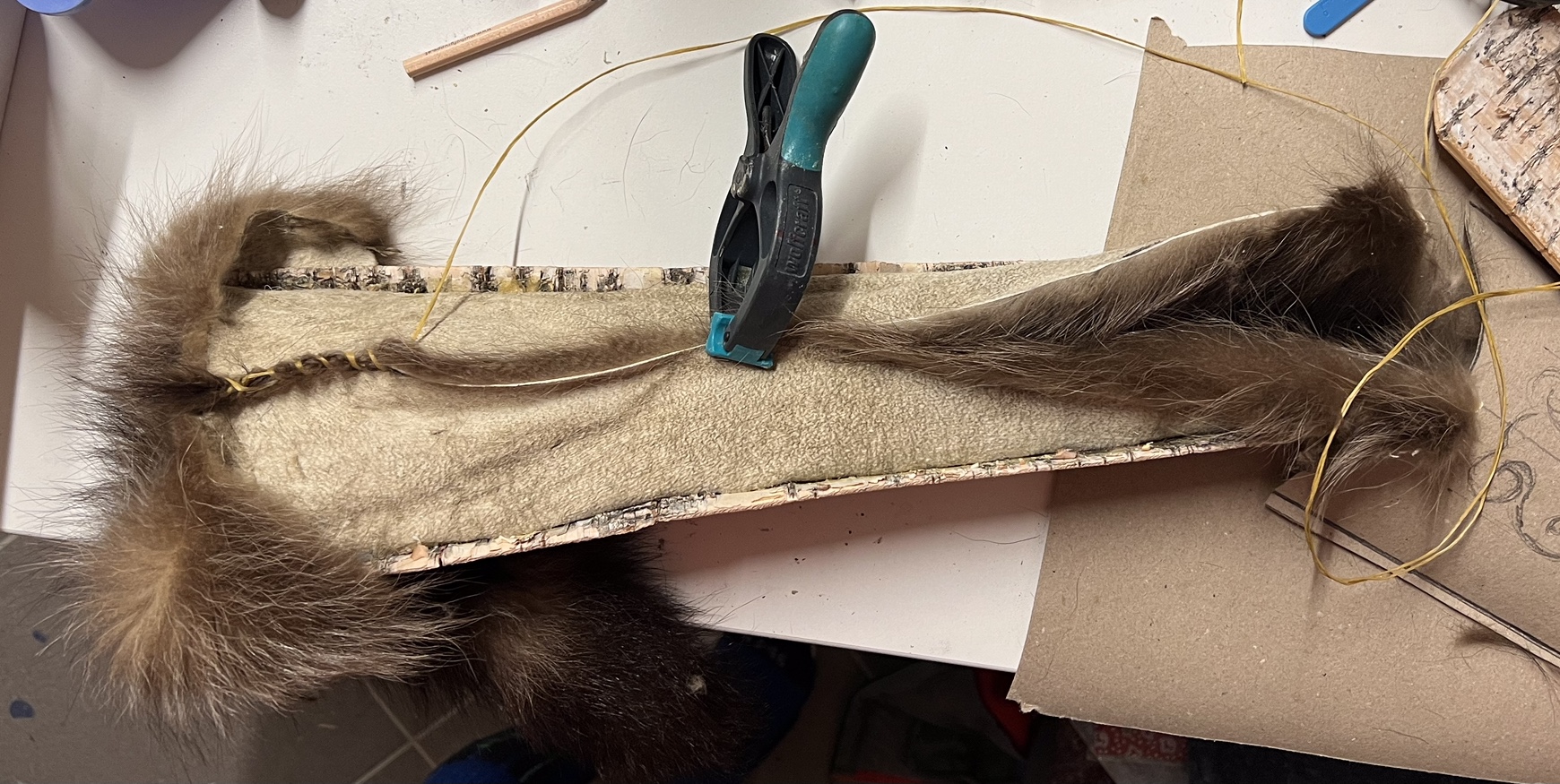 Das Fell habe ich mit Pattex Kraftkleber eingeklebt. Die Schlaufe ist mit 2 gegengleichen fortlaufenden Kunstsehnennähten verstärkt, die beiden Köcherhälften und der Boden sind fortlaufend mit Bast genäht. Auf die Vorderseite klebe ich jetzt noch Ornamente aus Kirschrinde lG Stephan