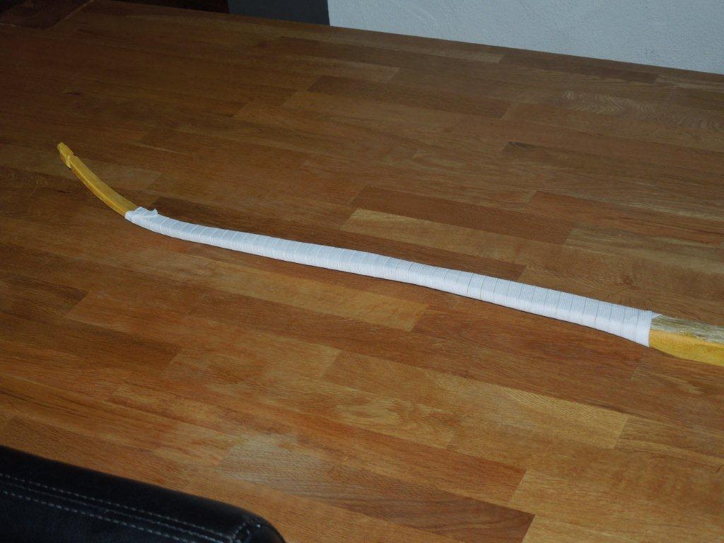 5. Nach 12 h wickle ich ab. Da brauch man auch keine Rücksicht nehmen: der Hosengummi löst sich wunderbar. Die Sehnenschicht ist meist schon ziemlich trocken und hat nach weiteren 12 h eine Farbe wie Bernstein, halb durchsichtig, man sieht noch die Maserung vom Holz und alles ist glatt. Schmirgeln fast nicht notwändig.