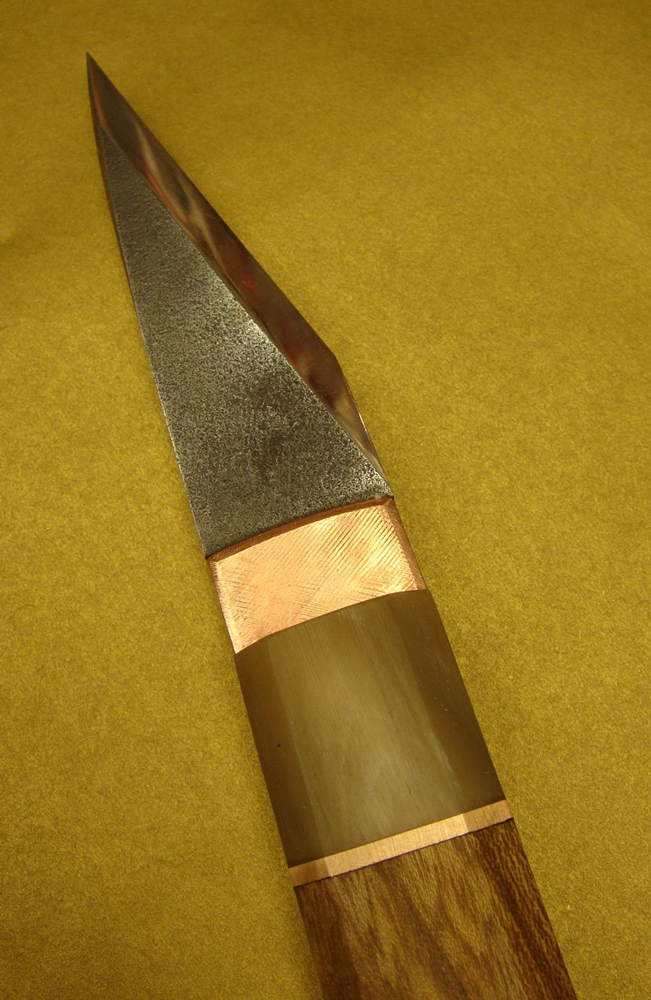 Klinge ist aus Sägeblatt, Griff Rüster, Kupfer und Kuhhorn.