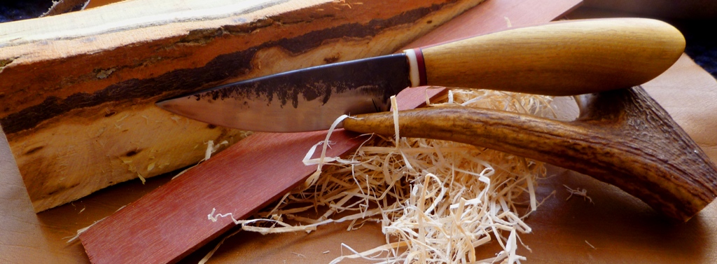 Stahl wieder Federstahl vom Auto, Griff aus Robinie, Massa, Hirschgeweih und etwas Zierlaminat.