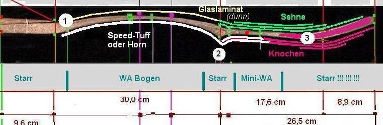 @Rabe: was hälst Du davon (Grafik)? das schwierigste wird glaub ich das Kräfteverhältniss angemessen zu bestimmen - das wichtigste: die Nadeln müssen den Druck auch halten (daher nochmal seitlich mit Knochen verstärkt) - die Mini-WAs dürfen nicht zu starr sein das sie sich noch etwas mitbiegen - und WAs und Mini-WAs müssen natürlich kräftemäßig auch aufeinander abgestimmt sein, damit sie beide optimal biegen - hab mir das im Geiste mal in Zeitlupe vorgestellt: gespannter Bogen - optimale Biegung am grossen und am kleinen WA - Sehne loslassen - der gesamte Arm funktioniert wie ne Peitsche - der grosse WA zieht den kleinen nach vorn, der kleine + Recurve beschleunigen die Sehne wie sau - ein Traum, will nicht wissen wie weit die damals damit geschossen haben