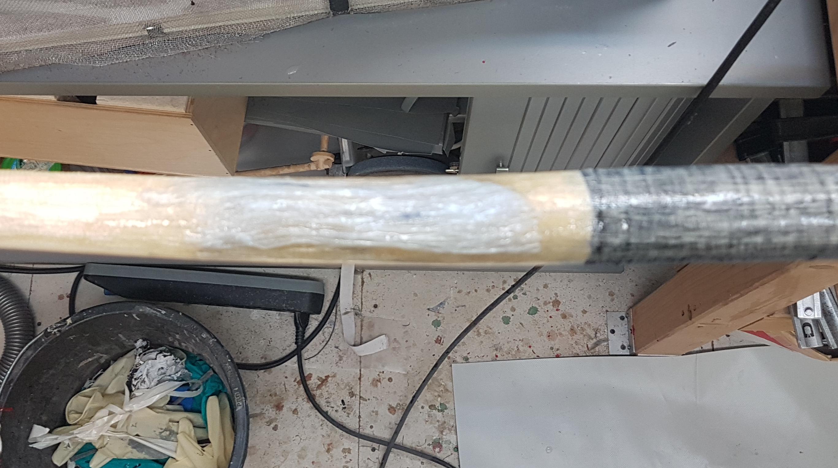 Außerdem gab es noch ein sehr dünnes Hornpatch über die Bruchstelle am Bauch (Foto vergessen). Da ich nicht lange warten wollte, habe ich meinen Heizlüfter auf die Stelle pusten lassen, so dass der Bauch auf ca. 90° C erhitzt wurde. Das Epoxid ist dann nach 20 Min. ausgehärtet. Allerdings war das ein Spiel mit dem Feuer, bei 56° C rückenseitig habe ich den Lüfter abgeschaltet und das Konstrukt wieder runter gekühlt.