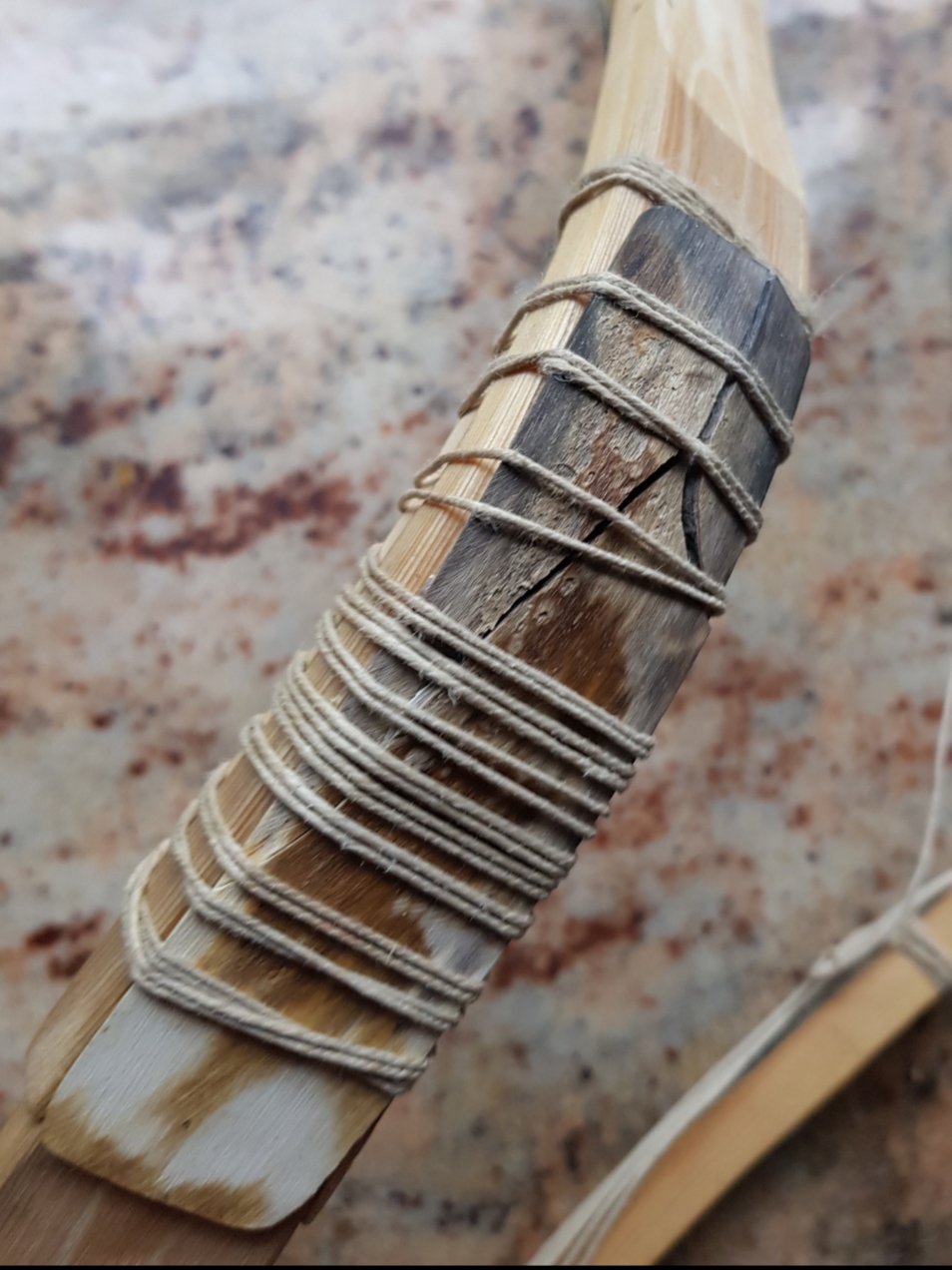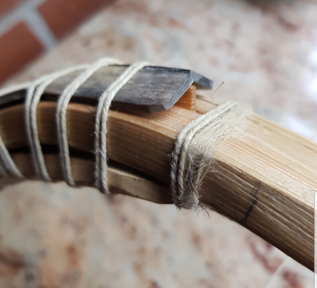 Fichte ist extrem zugschwach, steifer Griff und enge Biegeradien gehen gar nicht, der Biegebereich wären ja nur 30cm je WA gewesen und dann soll er fast einen Halbkreis biegen, das geht niemals, Rohhaut mehrteilig neigt immer zum heraus rutschen, muss daher ordentlich Überlappen und Antirutschstreifen aus Leder haben sich da bewährt, die Hebelkräfte im Spleißbereich sind enorm, deine Fixierung ist völlig unterdimensioniert, viel zu wenige Wicklungen, das Deckholz und das Horn müssen eng anliegen und den Spleiß zumindest 1cm überlappen und brauchen dort eine durchgehende enge straffe Wicklung über 2cm. Der Winkel des Bogenknies ist zu groß, das hält der Innenbogen nicht aus, das Kabel ist unterdimensioniert und kann die Zugkräfte nicht ausreichend aufnehmen. LG Stephan