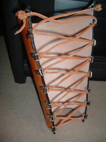 Ich habe meinen ersten Armschutz aus dem Schaft eines kaputten Lederstiefels gebaut. Wenn der Stiefel schon lange eher eine "sandale" ist, ist dennoch der Schaft meistens noch in Ordnung und viiiiel zu schade zum wegwerfen ! Tragespuren (zusammengerutscht oder so) kriegt man ganz gut weg, wenn man das Leder feucht aufspannt.