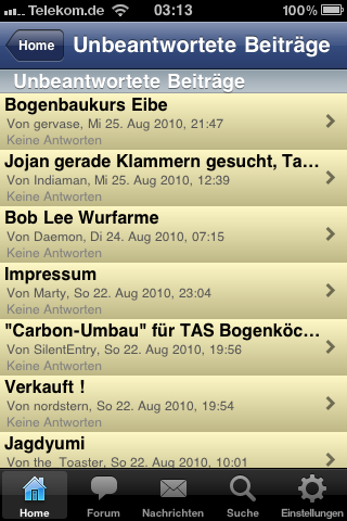 Da ich seit ein paar Wochen IPhone Besitzer bin, habe ich mich vorhin mal umgeschaut, wie man am besten unser Forum mit dem IPhone ggf. von unterwegs besuchen kann. Eine bessere Möglichkeit als mit dem Safari Browser bei dem natürlich Grafiken etc mitgeladen werden, die man unterwegs eigentlich nicht braucht, ist eine App für unsere Forensoftware phpbb. Die App nennt sich Touchbb und ist im IStore als Freeware und als Kaufversion für 79Cent verfügbar. Mit dieser App kann man nicht nur im Forum lesen, sondern auch Posten und IMs/PMs senden und lesen. Eine sehr geniale App für unterwegs.