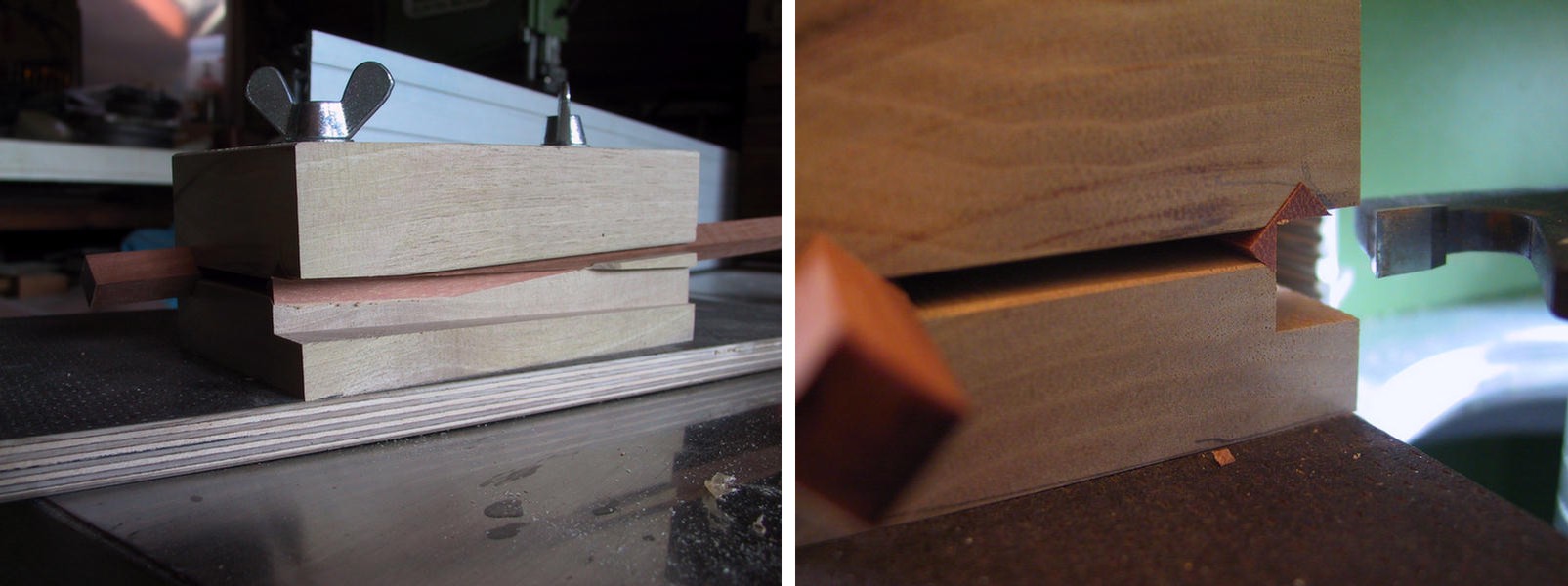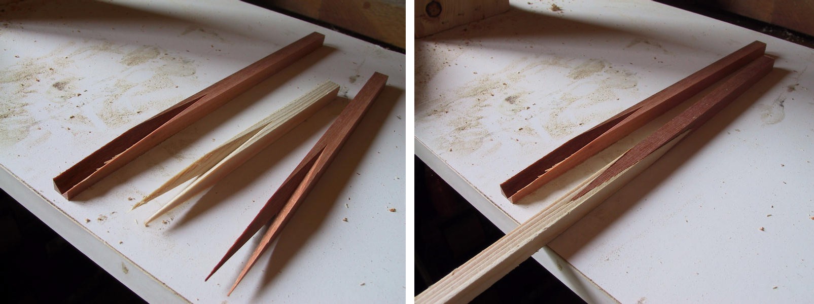 diese Hartholzstück jetzt in der Mitte teilen und, mit den Nuten innen, paßgenau zusammenlegen.