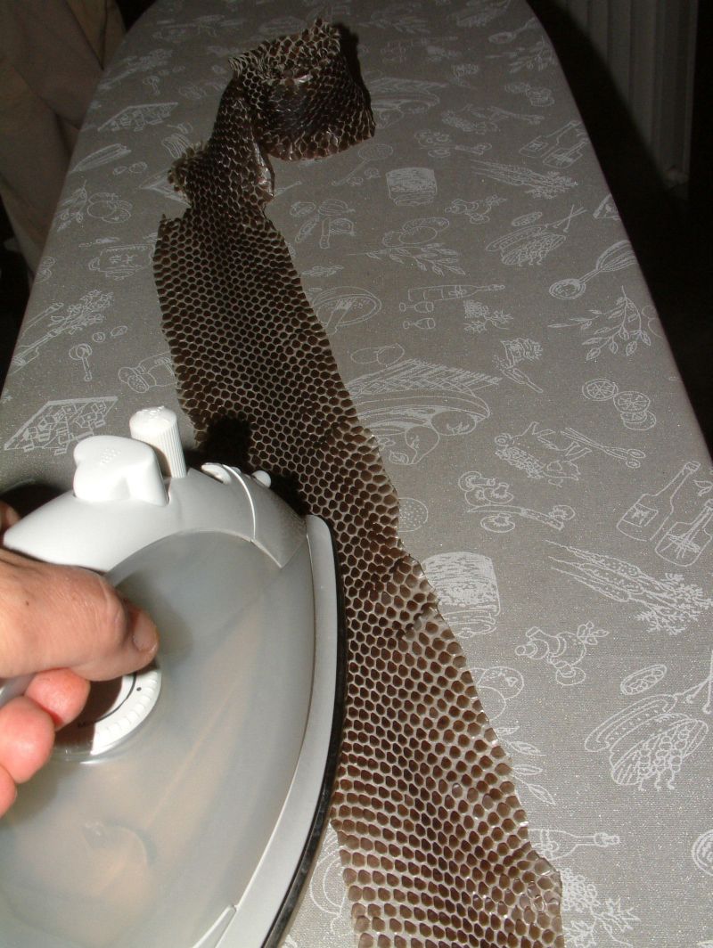 Danach wird die Haut aufgerauht für die Lackierung. Diese ist zwingend notwändig. Man muss sich das so vorstellen: Auf dem Holz wird die dünne Hornhaut mit dem Kleber fixiert, auf der Oberseite ist sie noch ungeschützt und kann u.U. leicht abgerubbelt werden. Ich rauhe immer mit Stahlwolle auf. Wenn sich hierbei die Schuppen lösen, haben wir nicht immer ein Problem. Es gibt Schlangenhäute, bei denen halten die Schuppen, bei den Natternhemden ist es ähnlich, z.B. bei der Vierstreifennatter halten sie, bei der Peitschennatter nicht. Werden nun die Schuppen runtergerubbelt, so hat man immerhin noch eine Schlangenhaut-Struktur, die auch ganz gut aussehen kann (Bild kommt später).