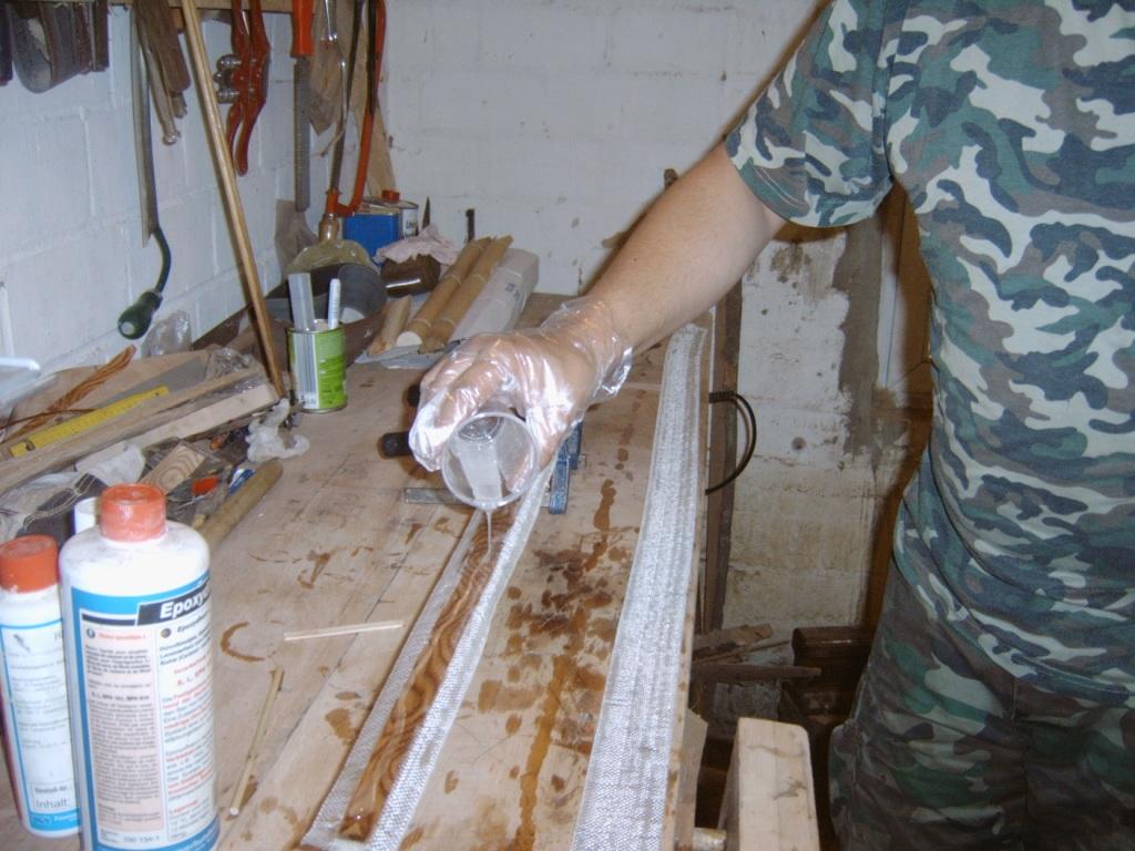 Für einen Bogen mit den Maßen 1,48m, Wurfarmbreite 35mm, der mit 2 Streifen Glasfaserband belegt werden soll, sollte man schon gut 30g Epoxyd anmischen, bei einem Streifen reichen 20g...