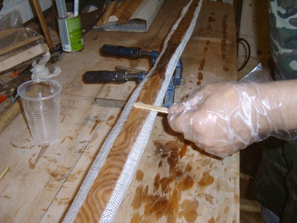 4: Mit Glasfaserband kann man auch eine unregelmäßige WA- Oberfläche (z.B. eines Selfbows, bei dem man das Zuggewicht erhöhen möchte oder der schlicht einen stabilen Bruchschutz benötigt...) mit Glas belegen...