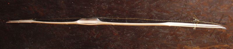 Der Bogen ist aus Ahorn(im Griff gespleißt) und mit Papier belegt.Circa 57 lbs bei 26 Zoll von der tiefsten Stelle des Griffes gemessen.Pfeilgeschwindigkeit 172 fts/sec bei einem Pfeilgewicht von 33 Gramm.Durchschnittliche Schußweite 195 Meter.
