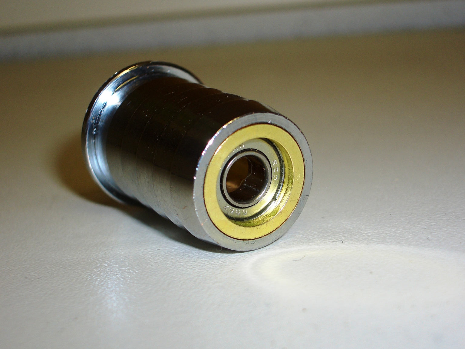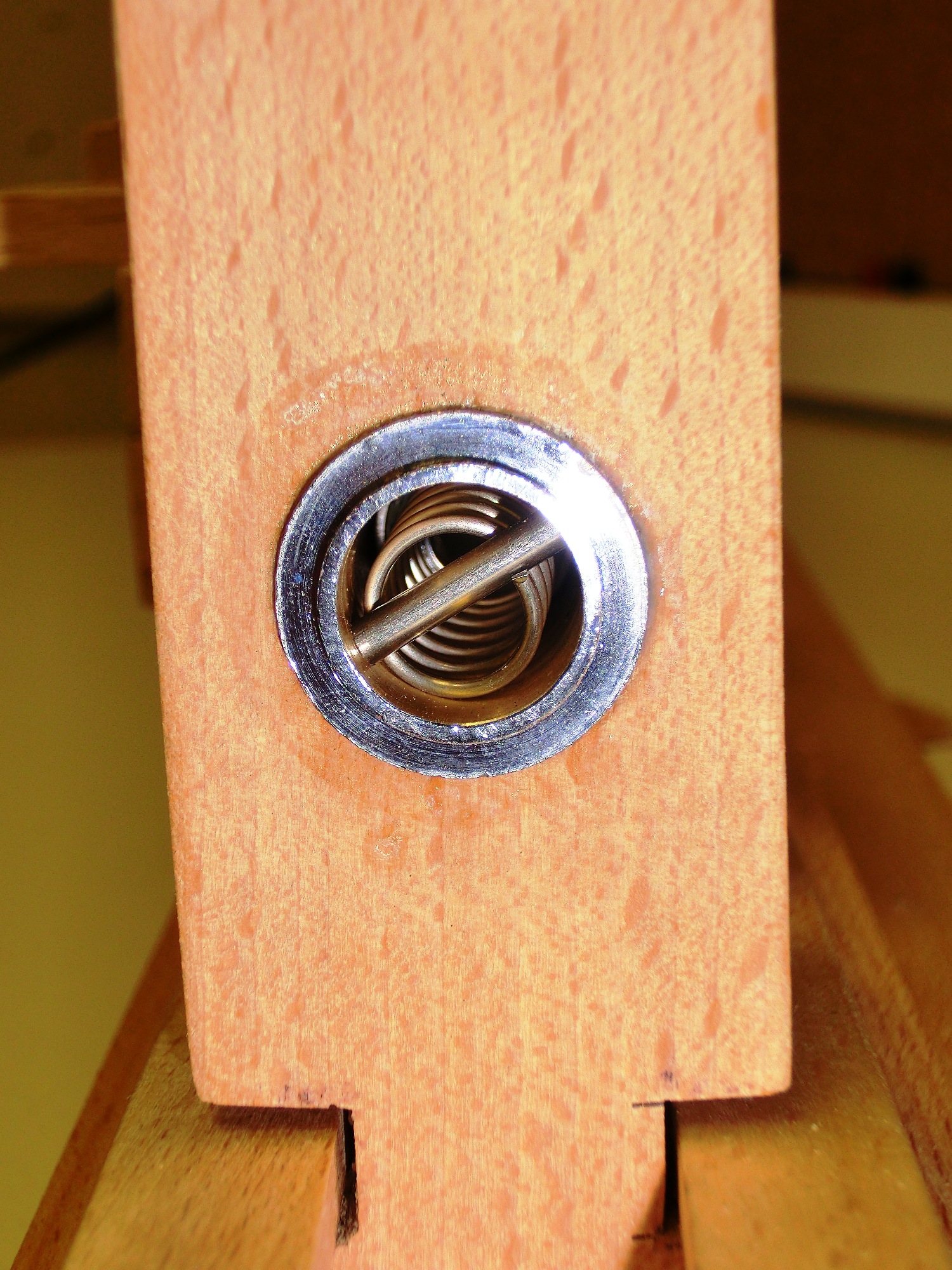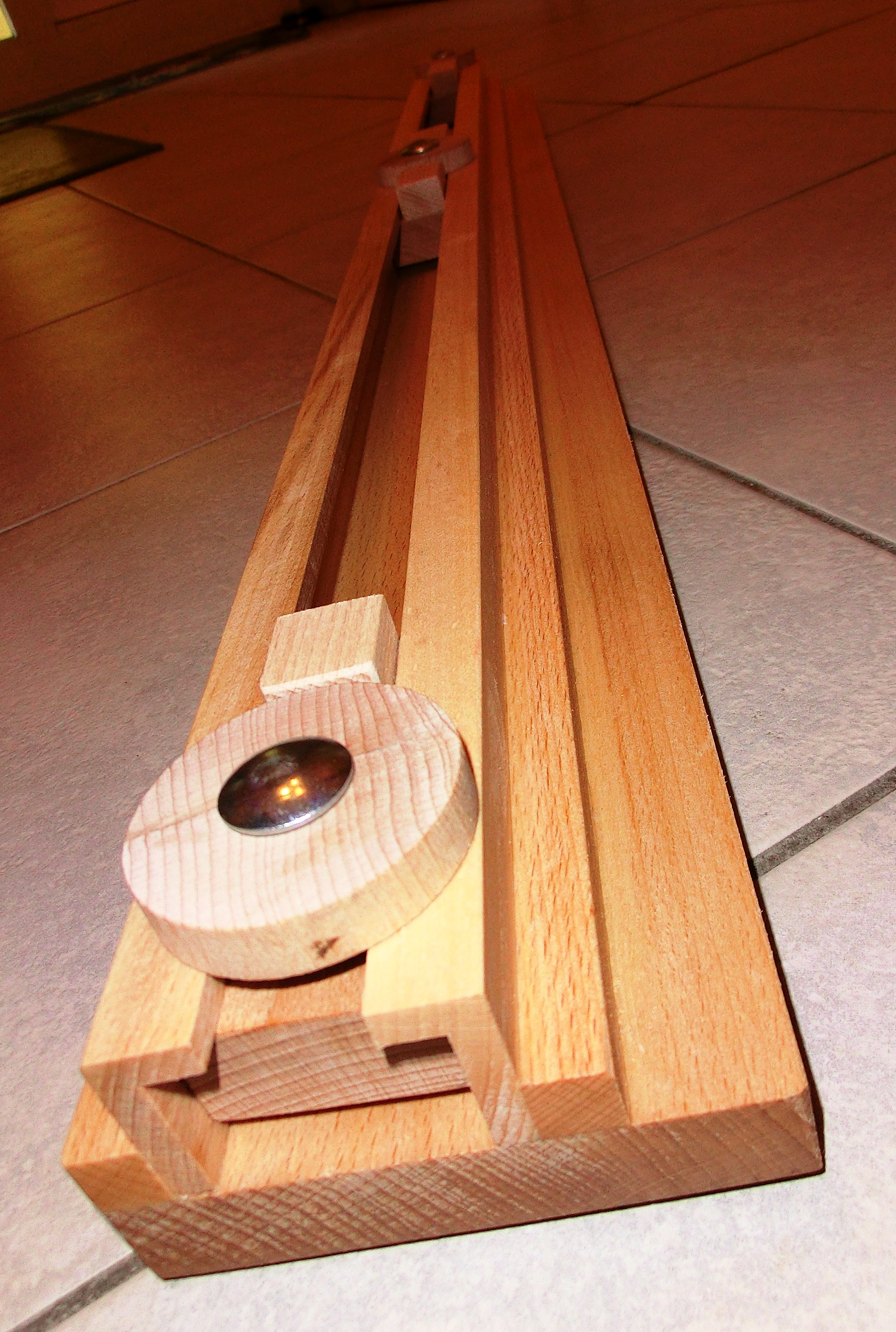 Aus der Buchenleiste Teile abschneiden (diese sind dann als Führung innerhalb der Schiene im Sockel, Länge nach belieben) und in der Mitte ein passendes Loch bohren (Groß genug, damit Einschlagmutter ohne Gewalt und doch streng reinpasst). Von unten dann die M8 Einschlagmutter vorsichtig einschlagen oder mit dem Schraubstock eindrücken.