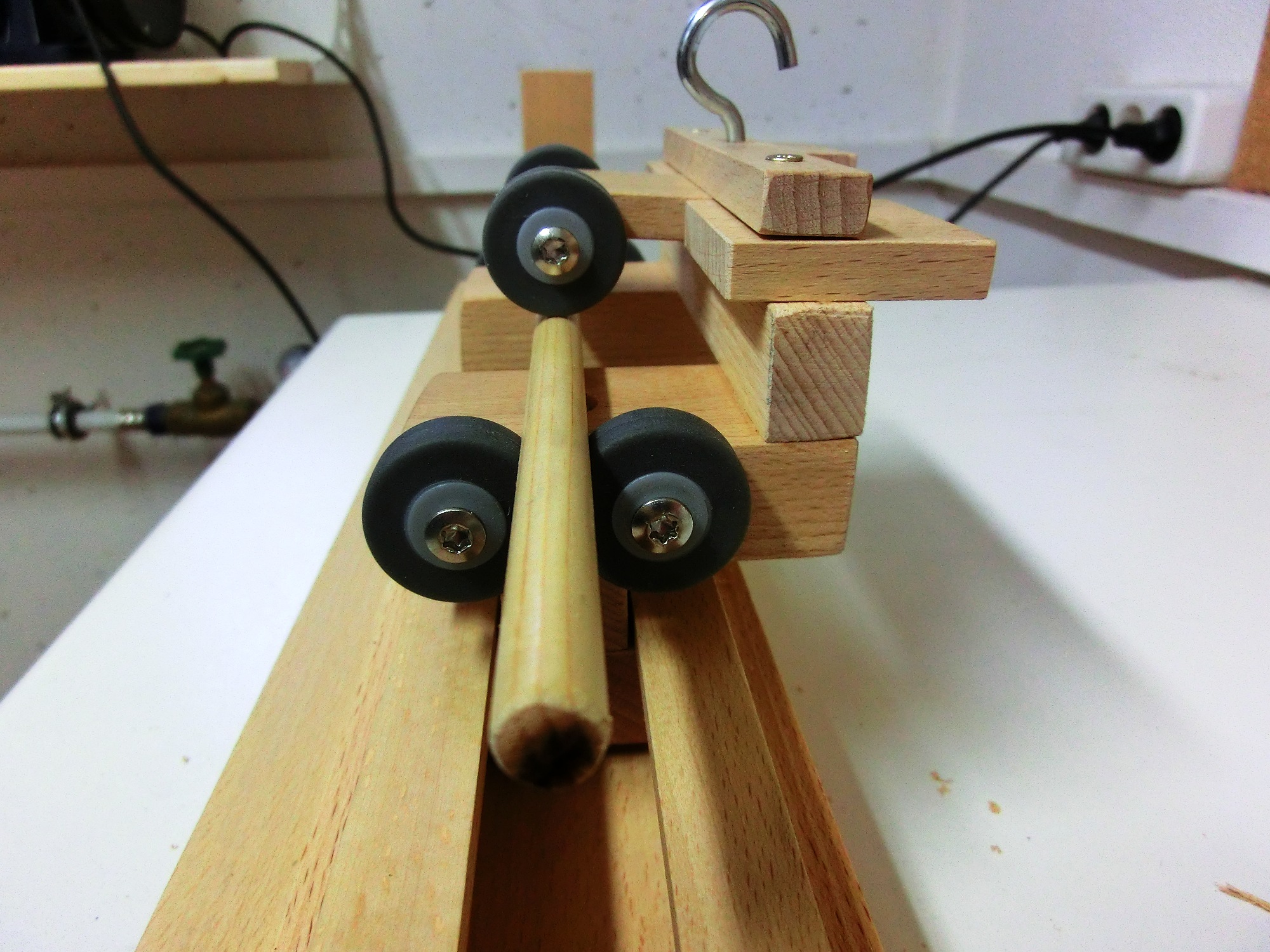 Aus der Buchenleiste 20x15 wenden dann noch kleine Teile abgesägt und aufgeleimt. Aus diesen werden dann div. Anbauteile wie z.B. Motorbefestigung,.. angebracht. Schraube mit Holzrad eindrehen und das Teil in die Schiene reinschieben. Auf Leichgängigkeit achten. Die Teile können nun an jeder beliebigen Stelle mit dem Holzrad fixiert werden.