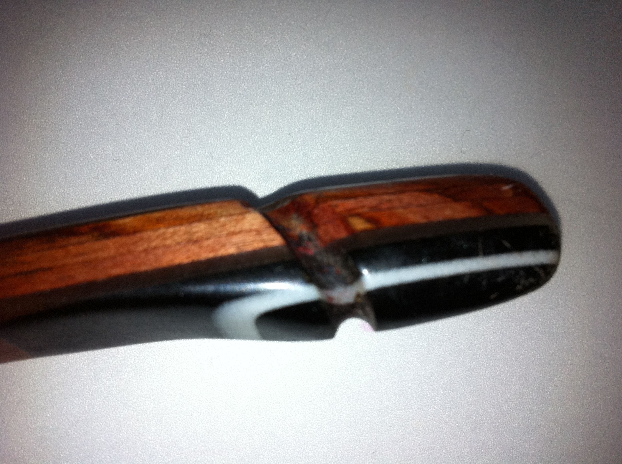 Geweih geeeeht auch, ABER das Zeug ist von innen ja eher Porös und kann daher probleme machen. Richtiges Horn (egal von welchem Tier, wenns denn Horn ist) Ist von innen sehr homogen, dicht, und fest und lässt sich überals glatt polieren, ebenso wie Micarta oder ein hartes, dichtes Holz.