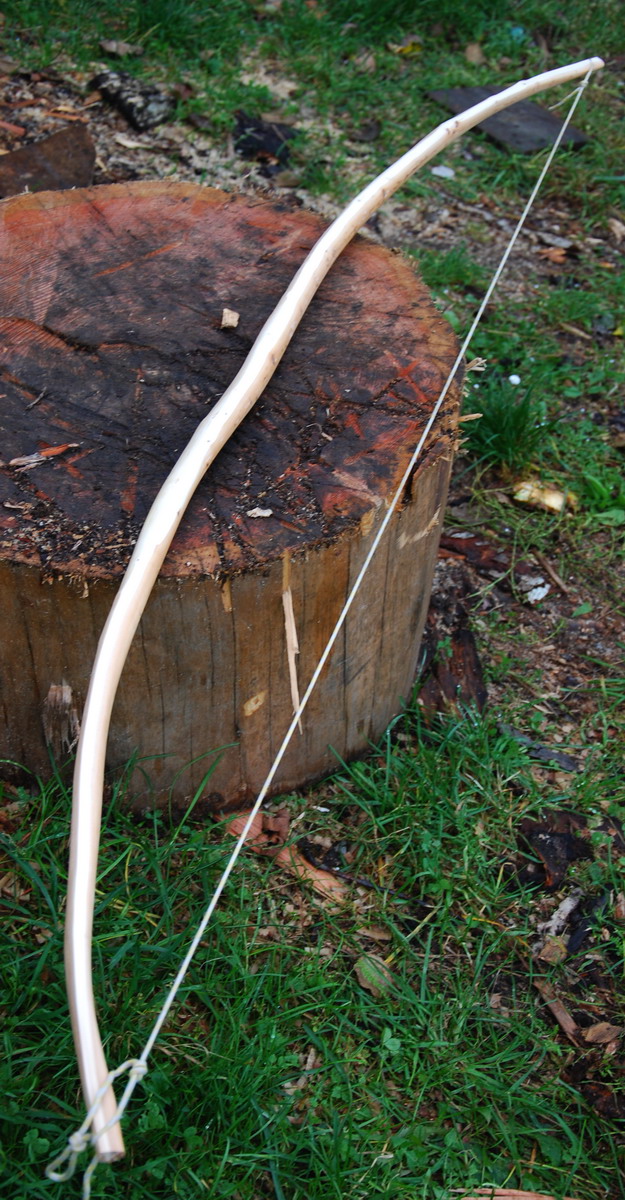 Bei diesem ersten Projekt war die Frage geht aus diesem dünnen Ast was vernünftiges also ein netter kurzer Bogen mit mindestens 30# Zuggewicht.