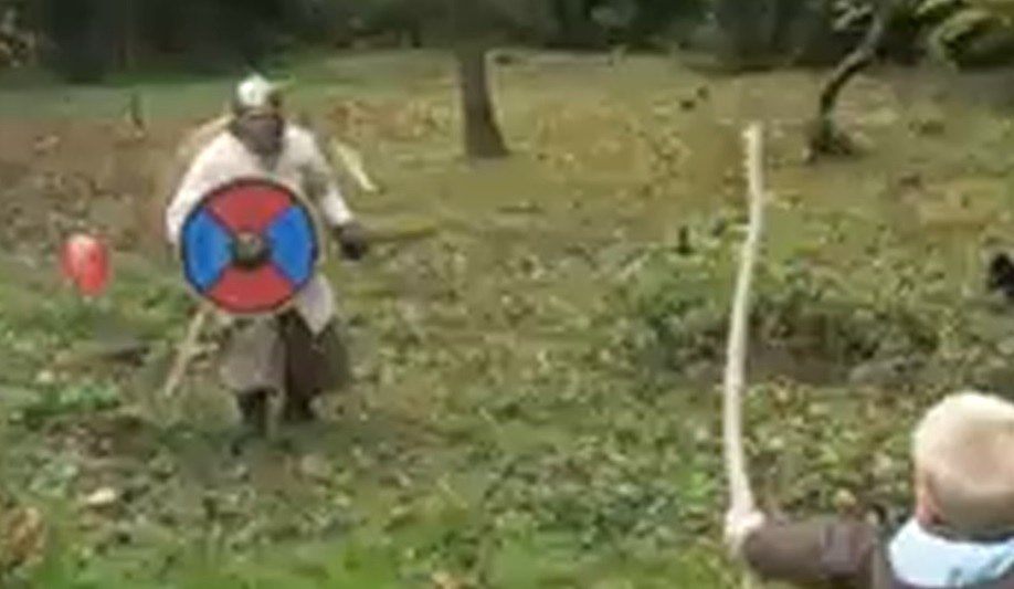 Und der Pfeil geht GENAU in Sehschlitz-Höhe nur handbreit daran vorbei. 15 cm weiter links, und der "Wikinger" hätte das vmtl nicht mal überlebt.