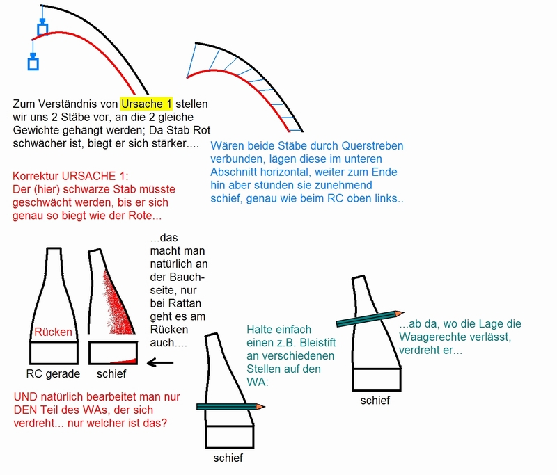 Normalerweise sagt man ja, dass wenn sich der Wurfarm verdreht, die "tiefere" Seite zu schwach ist (in der Skizze die linke Seite), und man daher an der "höheren" Seite Holz entfernen muss.