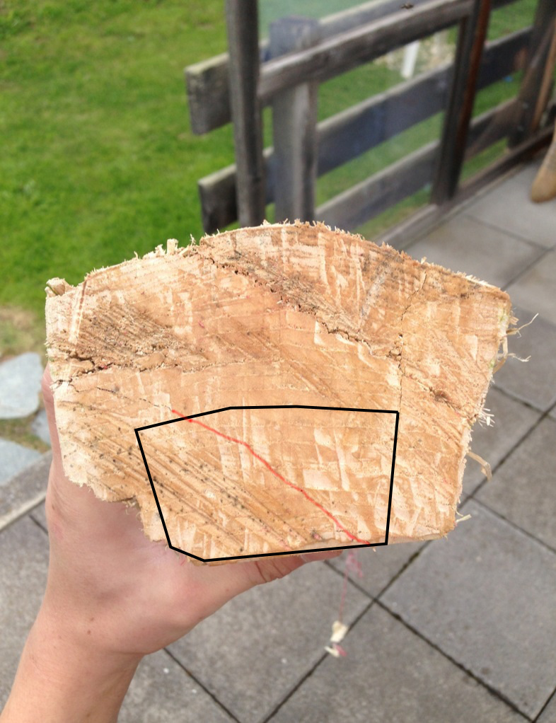 Was mich allerdings ein wenig stört ist die feine Linie, die ich rot angesprayt hab. Wenn das ein Riss ist, der durchläuft, seh ich da mit dem Stück Holz nicht viel Zukunft außer einer feurigen...