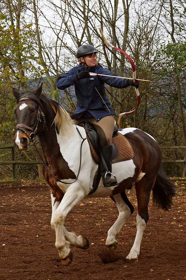 Am Sonntag hab ich dann mein Pferdchen in die Pläne eingeweiht und ein paar Pfeile neben ihm abgeschossen. Und dann von oben: Ergebnis: er trägts mit Fassung. Ich hab dann noch ein paar Pfeile im Schritt und Trab geschossen (naja, eher geploppt, damits erstmal nicht ganz so laut ist), festgestellt, das Trab nicht so die ideale Gangart dafür ist, aber immerhin mein 1,20 x1,20 m Ziel fast immer getroffen (Trick hier: schön dicht dran vorbeireiten).