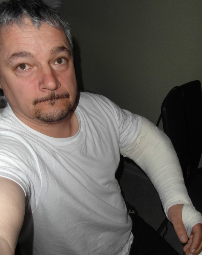 Mein Mitgefühl hast du. Ich hoffe nur dass es nicht der Arm ist den man/Man fürs "halb Liter stemmen" braucht.