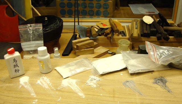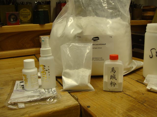 Was man aber z.B. leicht selbst machen kann ist das "etwas bessere" (hellere) graue Fudeko aus Japan. Da wird nur die Asche gesiebt und mit Magnesia (Kletter- oder Turnerkreide) versetzt. Derart aufbereitetes Fudeko schmutzt weniger, ist aber dafür umso alkalscher.