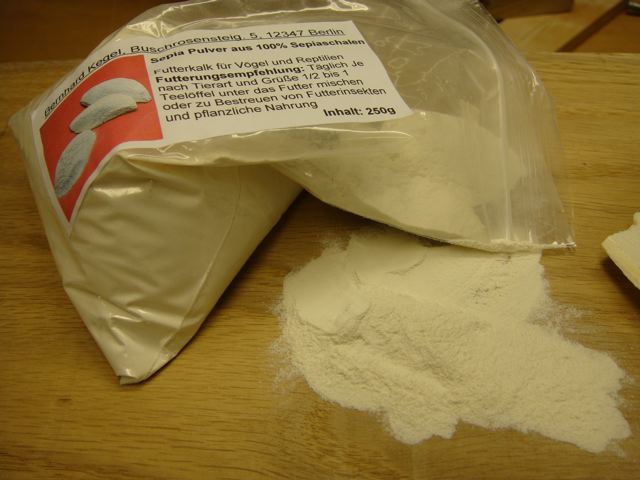 Das ist auch das Problem mit dem fertig-gemahlenen Sepia Pulver... es ist zu fein und es stinkt. Man mahlt die gesamte Schale - mitsamt Geweberesten und harter Aussenschale. Damit sich Reptilien beim Fressen nicht an Stücken der harten Aussenschale verletzen wird sehr fein gemahlen.