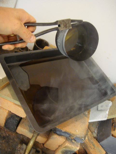 Die dünne Kolophonium-Platte lässt sich leicht zerkrümeln und die Krümel lassen sich in Sekunden zu Pulver mahlen, indem man sie durch ein Metallsieb reibt.