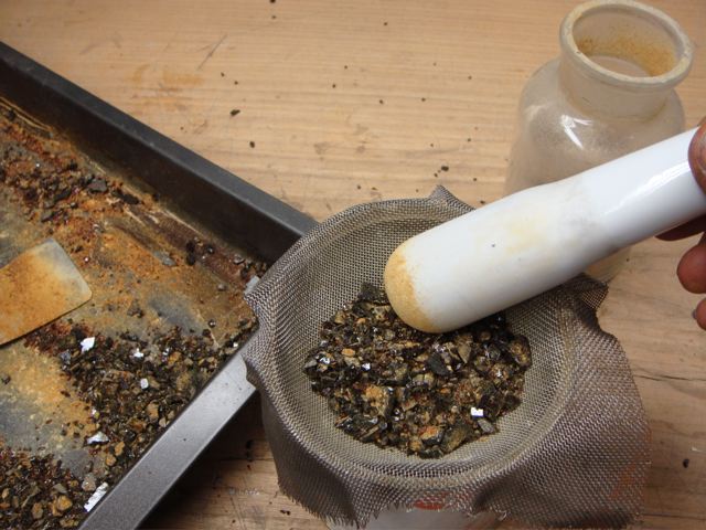 Mit dem Pistill durch ein Sieb gerieben gibt schönes körniges Pulver, das noch knirschig ist beim Auftragen.