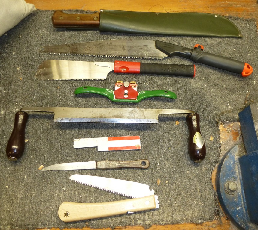 Werkzeuge: grosses Ziehmesser, Ziehobel, Stechbeitel und Pinsel.
