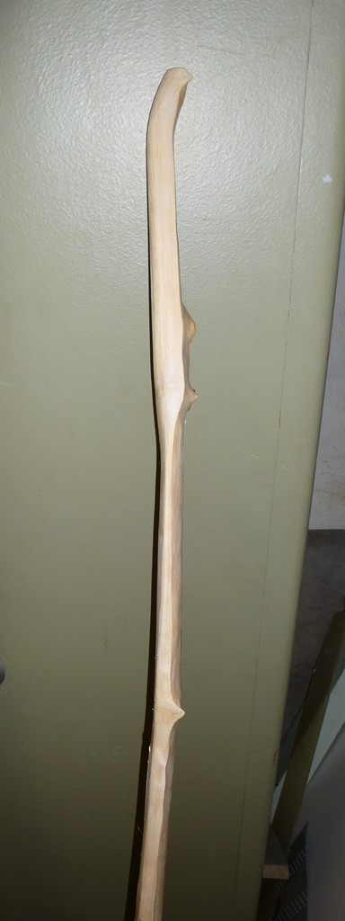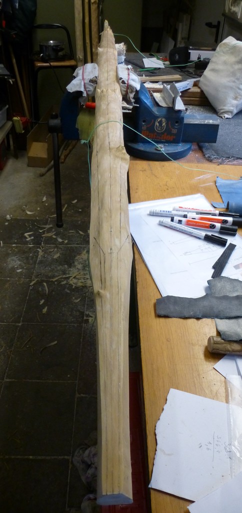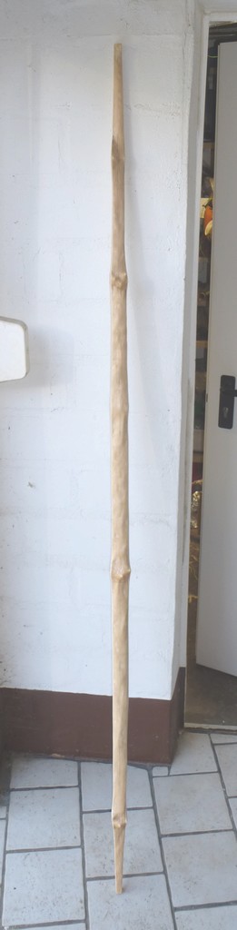 Das Profil ist linsenförmig und die Übergänge zum Griff und zu den Needles sind schon angelegt. Die Needles müssen noch deutlich dünner, aber ich hab ja noch ein wenig Zeit. Der Markkanal im Griff wird noch mit Holz gefüllt und ich überlege ob ich Holler vom gleichen Stamm nehme oder was Besonderes ... ich hätte noch Berberitze oder Robinie da ... doof ist nur, das der Kanal nicht mittig im Griff sitzt. Mal schauen. Zur Zeit 1030g.