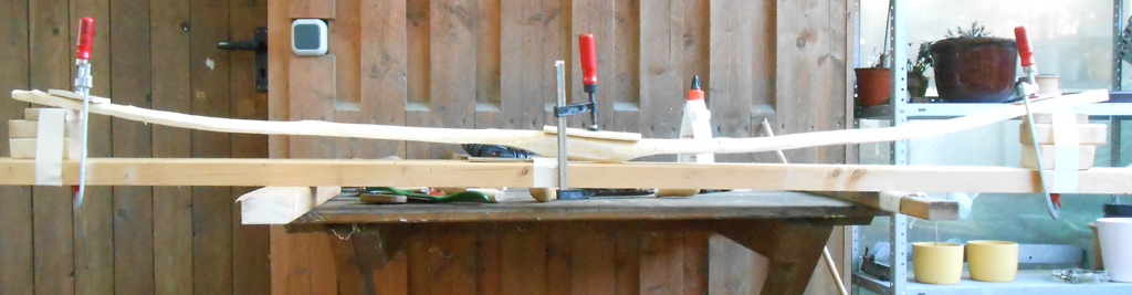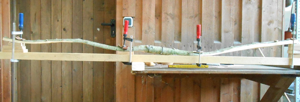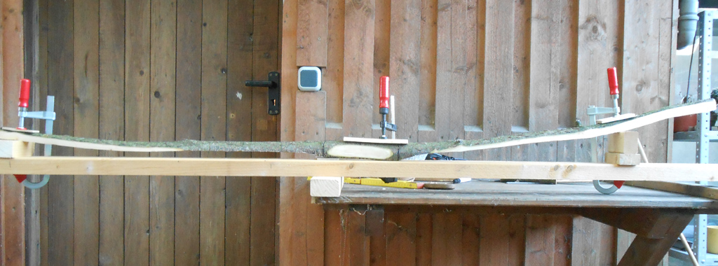 Gestern habe ich noch mal die äußerste Rindenschicht abgezogen und der Rohling ist in die Werkstatt umgezogen. Heute habe ich die restliche Rinde mit einem stumpfen Stachtel abgezogen, funktionierte damit sehr gut und einfach. Zusätzlich habe ich die Wurfarme noch ein wenig ausgedünnt. Der Rohling steht jetzt erst einmal, auf einem Kantholz aufgespannt, weiter in der ungeheitzen Werkstatt und kann langsam weiter trocknen.Der Sehnenverlauf muss in den nächsten Tagen noch ein wenig korregiert werden. Ich werde das wahrscheinlich mit der HLP im Griffbereich machen. Das einzige Problem (oder Frage), dass ich zur Zeit habe ist: