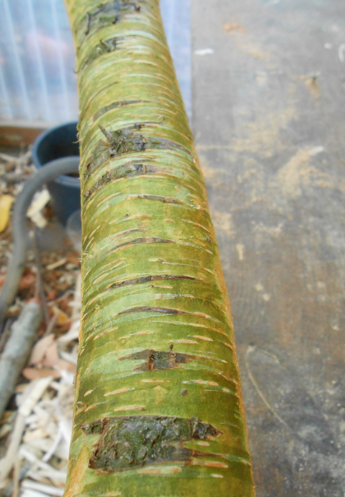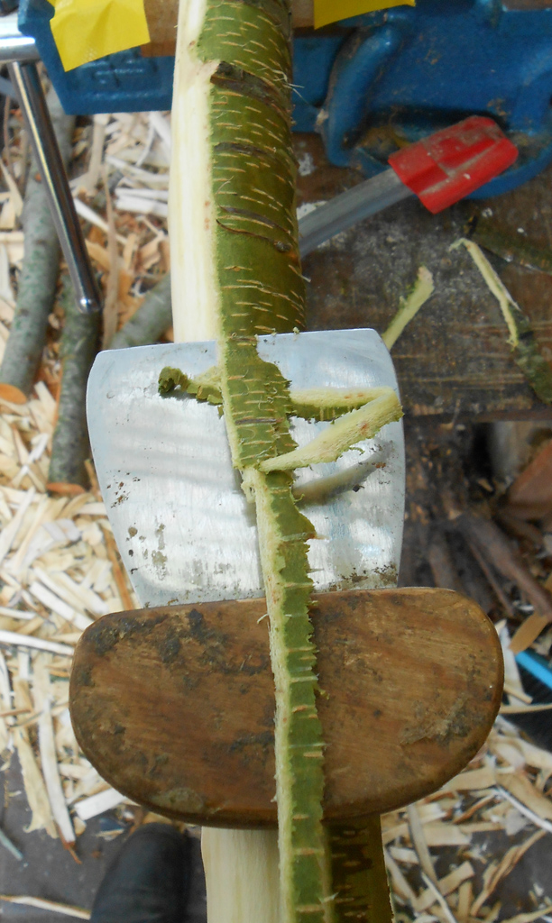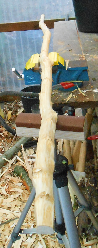Gestern habe ich die Rinde (wieder mit dem stumpfen Spachtel) abgezogen, allerdings war es deutlich mehr Aufwand als bei der Traubenkirsche. Die Rinde sitzt deutlich fester drauf und ist auch faseriger als bei der Traubenkirsche. Ansonsten habe ich noch die WA´s ein wenig dünner und schmaler gemacht. Probleme könnte es am oberen WA geben, denn es sieht so aus, als ob sich Insekten im Rohling unter der Rinde eingenistet hatten. Fraßkanäle sind es aber anscheinend nicht, es scheinen nur Spuren zu sein, da das Holz wohl nicht direkt verletzt ist. Auch der Weißdorn lagert weiterhin aufgespannt in der zeitweise beheizten Werkstatt
