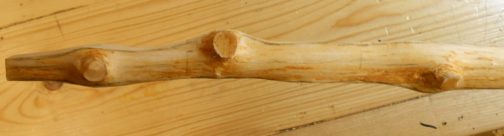 Beim Weißdornrohling habe ich , wie bei der Traubenkirsche, zuerst die Mittellinie und anschl. die Rohbreiten an den WA´s angezeigt, und danach ausgearbeitet.Der Sehnenverlauf ist ok, der Rohling hat sich also bisher nicht verzogen.Problematisch werden aber sichlich noch die Äste im unteren Wurfarm werden, denn bereits jetzt werden sie ein wenig rissig (trotz Versiegelung). Ich werden mal die nächsten Tage abwartet, wie sie die Äste bei der weiteren Trocknung verhalten. Sollten die Äste stark rissig werden, hab ich immer noch die Möglichkeit sie auszubohren, genug Material habe ich stehengelassen.