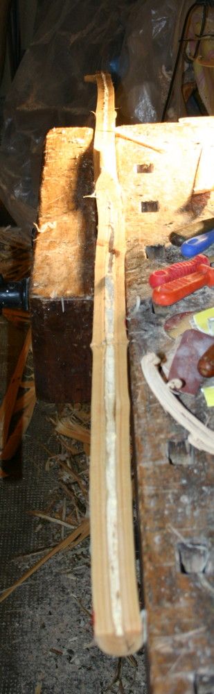Ich habe also den Stave gekürzt und 1,55 m blieben übrig. Anschließend den Griff festgelegt und die Wurfarme bis zum Markkanal heruntergearbeitet. 1,55m ist ja nun etwas kurz. Mal schauen, ob ich hier die Enden flippe und nen kurzen, knackigen Bogen versuche. Der Rücken hat keine Problemstellen, es könnte klappen.