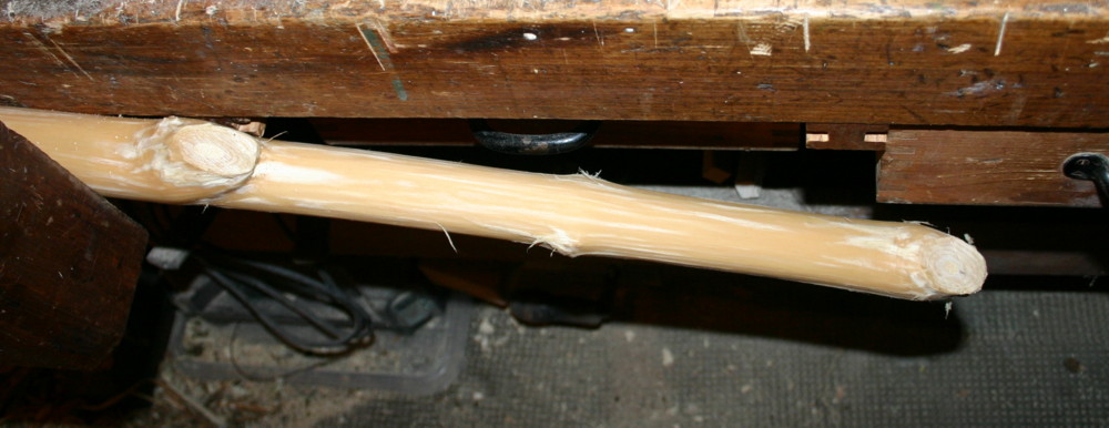 An einem Ende hatte der Stave einen gewaltigen Seitenast. Diesen habe ich entfernt, allerdings großzügig Holz stehen lassen.