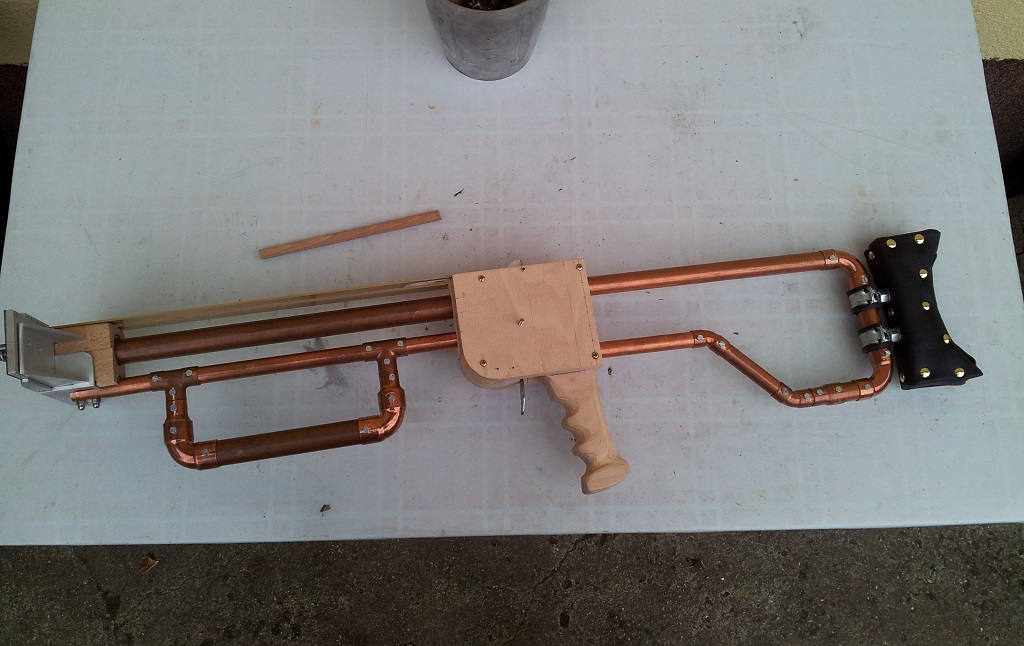Der Schaft wird zwar teilweise aus Holz bestehen, jedoch auch aus einem oder zwei Kupfer oder Messingrohren. Die Pfeilbahn wird dann definitiv aus Metall. Quasi zwei Schienen und in der Mitte der Pfeil ;)