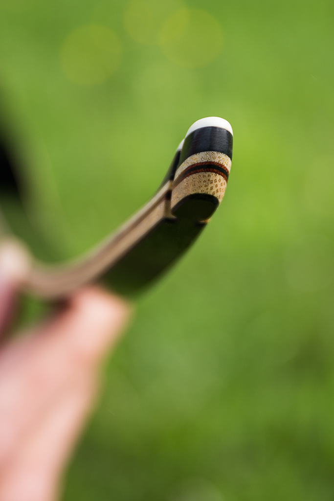 Das ist übrigens auch der erste Bogen von mir wo ein "nicht benötigtes" Laminat drin ist, denn unter und über dem Carbonkern ist ein Padoukfurnier verklebt das sich sequentiell durch den ganzen Bogen zieht. Leider kann ich jetzt mit weißen Ebenholz nicht mehr arbeiten. Trotz Feinstaubmaske und nahezu "Vollschutz" reagiert mein Körper auf dieses Holz mittlerweile ziemlich böse. Naja...es gibt ja noch mehr schicke Hölzer.
