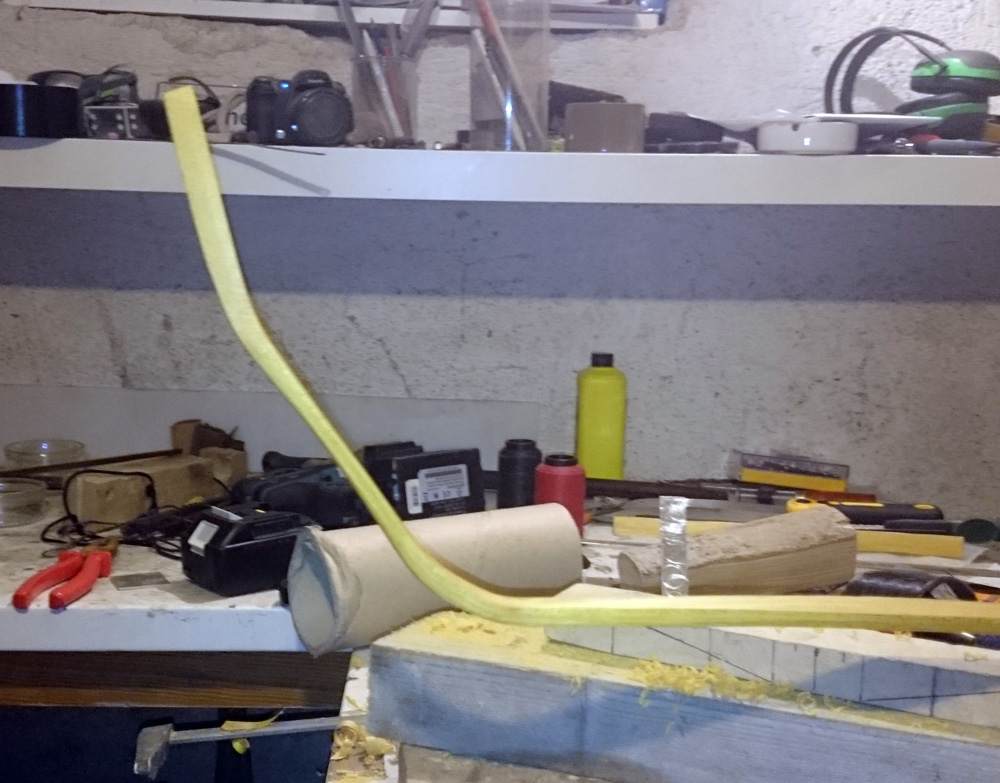 Warum ich bei dem schmalen Teil keine Sehne verwende hat 2 Gründe, erstens ich hab grad keine aufgefaserte Sehne rumliegen und 2. ich will wissen ob Osage bei diesen extremen Radien den unidirektionelen Flachs aushält.
