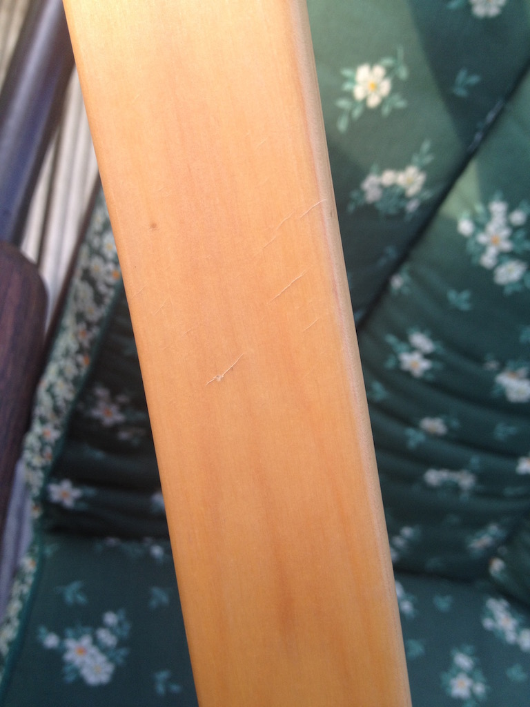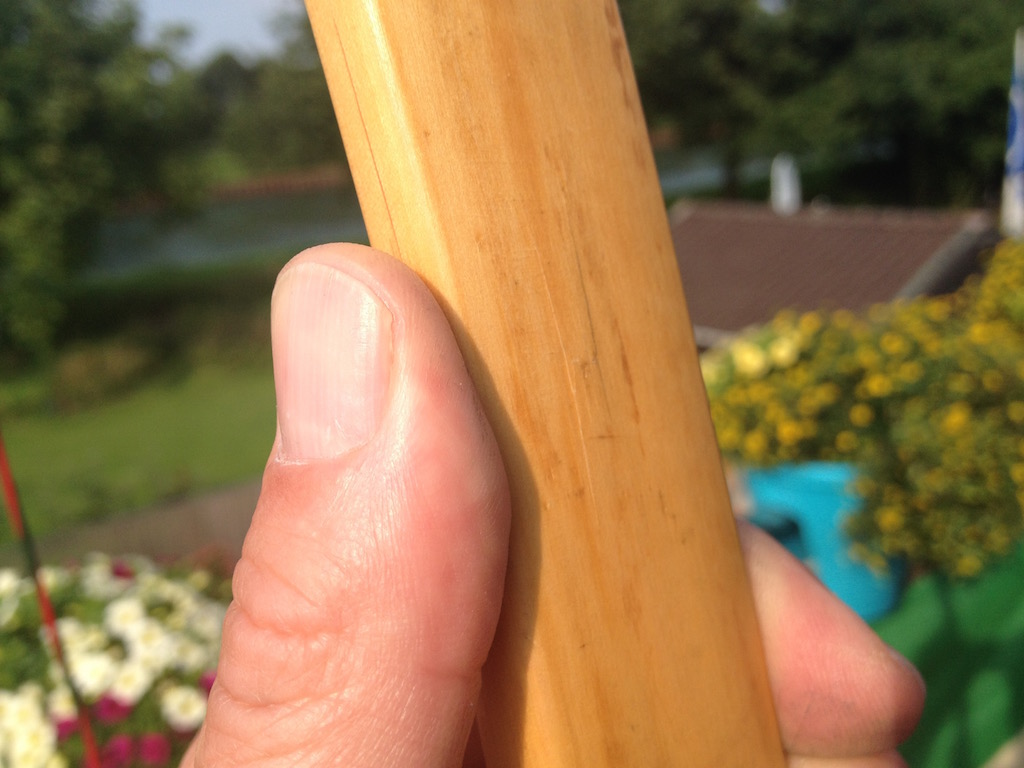 Ich glaube da wo die schadhafte Stelle ist einen Knick im Tiller zu erkennen. Eine Schwachstelle. Wenn bei dem Bogen alles angeglichen ist hast Du keine Kraft mehr darin.