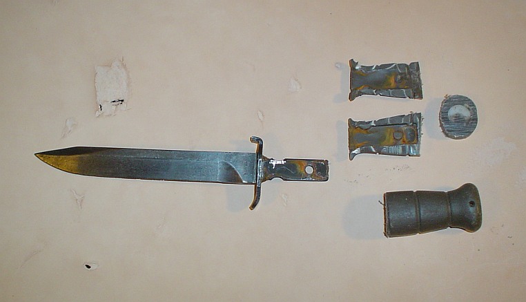 Einstweilen habe ich heute den billigen Plastikgriff entfernt und so sieht das Messer "von innen" aus: Wie man sieht, hat es einen kurzen Erl, der einfach mit zwei Nieten am gusseisernen Teil des Griffs befestigt ist. Qualität geht sicher anders, aber okay, das Messer war ja billig.