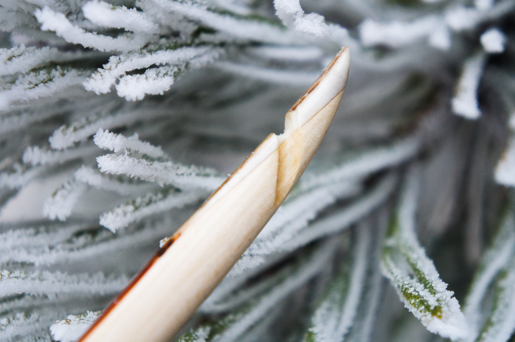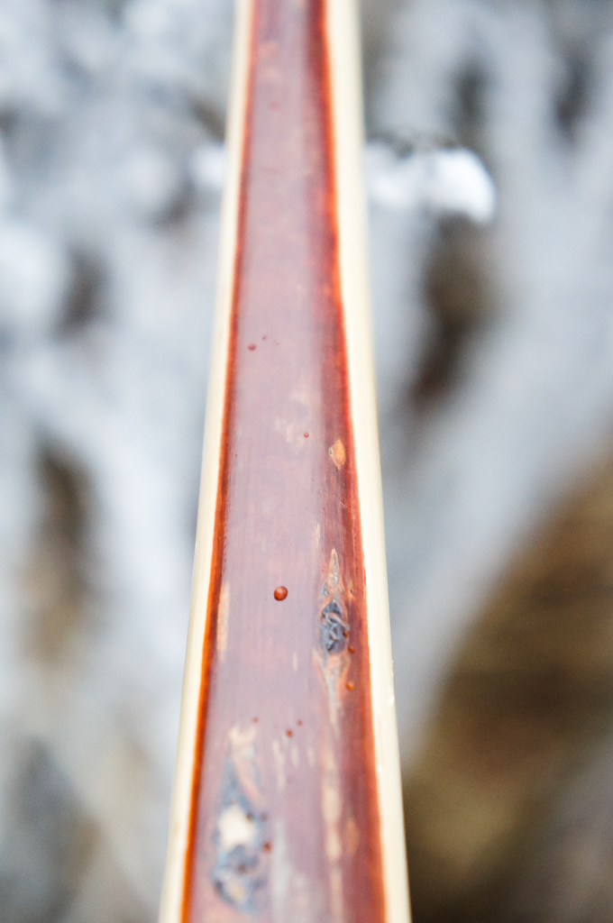 ein Haselnuss-Flachbogen mit einem Backing aus Kirschrinde, Geweihnocken und einer Pfeilanlage aus Büffelhorn. Der Bogen zieht sich außerordentlich angenehm und schießt präzise.