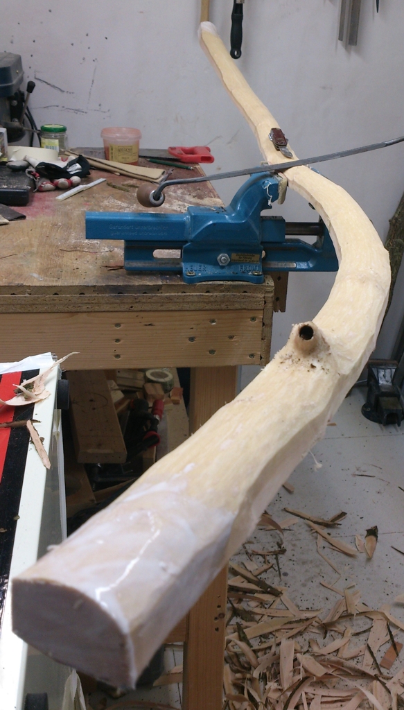 Eine Biegung sollte es noch werden, um eine für mich sehr ungünstige deflexe Stelle zu korrigieren und das hat nicht so geklappt wie geplant. Aber nicht, weil sichs nicht hätte biegen lassen, sondern weils Holz sich beim kochen ein paar cm in die alte Lage zurückgezogen hat und ich es dann nicht innerhalb der kurzen zur Verfügung stehenden Zeit geschafft habe das Holz in die Hilfskonstruktion einzuspannen. Und dieser Umstand hat dann einen Wutanfall nach sich gezogen und zur sofortigen Exekution des Hartriegel geführt - so isses halt manchmal