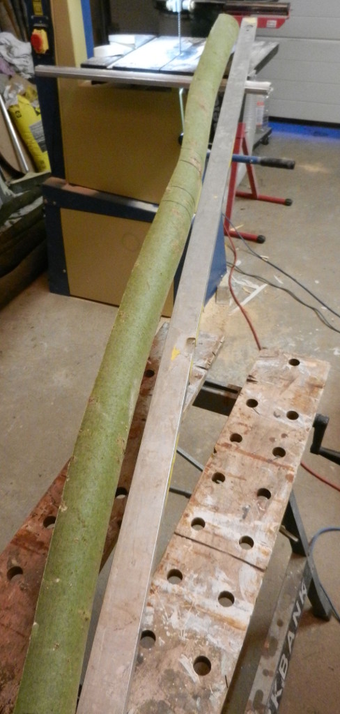 Ein Foto musste auch noch her. Mit dem Sägen hatte ich schon angefangen. Nur noch schnell den Durchmesser kontrollieren, bevor ich wieder ein zu dickes Exemplar nach Hause schleppe. Die Esche hat schöne Biegungen, aber das macht das Tillern nicht leichter. Schön in der Mitte auf der Bandsäge geteilt. Die Biegungen sind schön gleichmässig im oberen und unteren Wurfarm verteilt. Dann noch den Rückenring freigelegt. Das war schon etwas langwierig, 6 Ringe mussten runter. Ich denke die Arbeit hat sich gelohnt, aber eventuell nehme ich noch einen Ring ab. Der Rückenring hat eine interessante Struktur. Der Stave darf jetzt erst einmal ein wenig trocknen. Und ich überlege mir ein hoffentlich passendes Design.