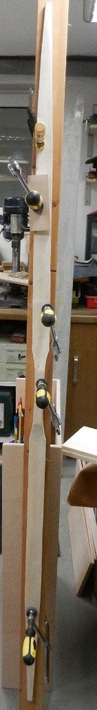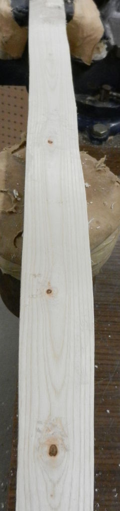 Am Donnerstag wurde die Esche weiterbearbeitet. Die Länge ist jetzt 176cm und die Breite liegt bei 4,7cm. Das Gewicht: 1139 g bei 18% Feuchtigkeit. Viel zuviel Masse, biegt sich auch nicht ansatzweise. Von Donnerstag bis Freitag hat sie 57g Wasser verloren.